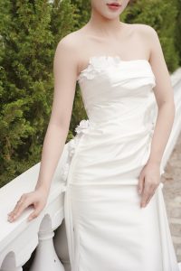 Váy cưới đơn giản và thanh lịch dáng đuôi cá, tạo nên vẻ đẹp gợi cảm và lộng lẫy trong ngày cưới của các nàng. Váy có dáng đuôi cá, tức là phần váy sau dài và ôm sát từ eo đến gần bắp chân, tạo ra hình dáng như đuôi của cá. Dáng váy này thường mang lại vẻ đẹp gợi cảm và quyến rũ cho cô dâu.