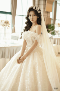 Váy có kiểu dáng công chúa với phần trên ôm sát và phần dưới xòe rộng, tạo ra hình dáng đầy ấn tượng và quyến rũ. Dáng váy này thường tôn lên vẻ đẹp nữ tính và mang lại cảm giác lộng lẫy cho cô dâu.